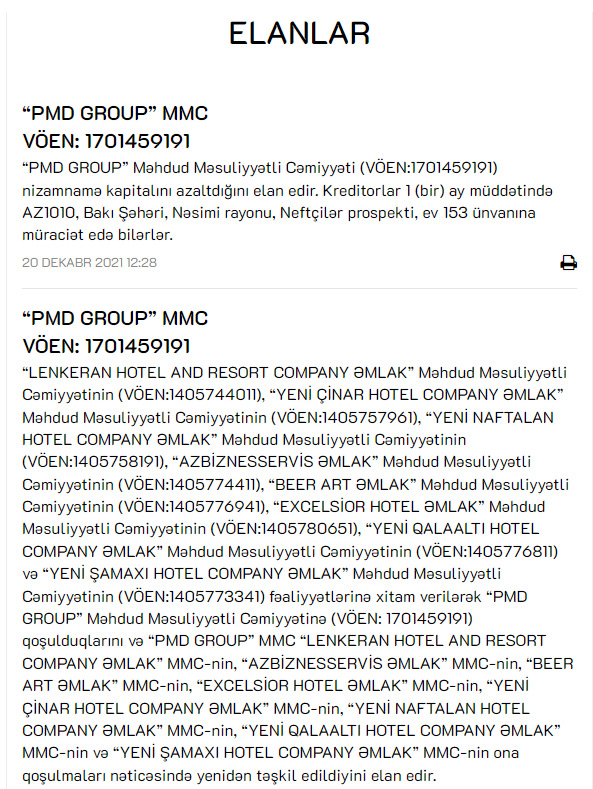Qeyd edilib ki, “LENKERAN HOTEL AND RESORT COMPANY ƏMLAK” Məhdud Məsuliyyətli Cəmiyyətinin, “YENİ ÇİNAR HOTEL COMPANY ƏMLAK” Məhdud Məsuliyyətli Cəmiyyətinin, “YENİ NAFTALAN HOTEL COMPANY ƏMLAK” Məhdud Məsuliyyətli Cəmiyyətinin, “AZBİZNESSERVİS ƏMLAK” Məhdud Məsuliyyətli Cəmiyyətinin, “BEER ART ƏMLAK” Məhdud Məsuliyyətli Cəmiyyətinin, “EXCELSİOR HOTEL ƏMLAK” Məhdud Məsuliyyətli Cəmiyyətinin, “YENİ QALAALTI HOTEL COMPANY ƏMLAK” Məhdud Məsuliyyətli Cəmiyyətinin və “YENİ ŞAMAXI HOTEL COMPANY ƏMLAK” Məhdud Məsuliyyətli Cəmiyyətinin fəaliyyətlərinə xitam verilərək “PMD GROUP” Məhdud Məsuliyyətli Cəmiyyətinə qoşulublar.
