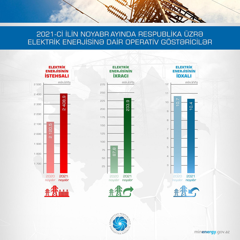 Energetika Nazirliyinin yaydığı məlumata görə, 2021-ci ilin 11 ayı üzrə elektrik enerjisinə dair operativ məlumatlara əsasən, noyabr ayında respublika üzrə elektrik enerjisinin istehsalı 2408,9 mln. kVt·st, ixracı 233,9 mln. kVt·st, idxalı 10,4 mln. kVt·st olub. Ötən ilin müvafiq dövrü ilə müqayisədə noyabr ayında respublika üzrə elektrik enerjisinin istehsalı 288,4 mln. kVt·st, ixrac 146,1 mln. kVt·st artıb, idxal isə 0,3 mln. kVt·st azalıb.