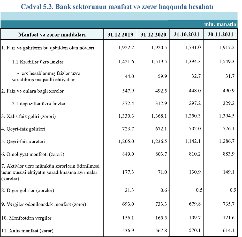 Bank sektorunun 35 milyard 604,5 milyon manatlıq cəmi aktivlərinin 16 milyard 282 milyon manatı müştırilərə verilmiş kreditlərdən, 4 milyard 754,6 milyon manatı qiymətli kağızlara investisiyalardan ibarət olub. Noyabrda müştərilərə verilmiş cəmi kreditlər 284,7 milyon manat, ötən ilin sonu ilə müqayisədə (11 ayda) isə 2 milyard 125 milyon manat artıb.
