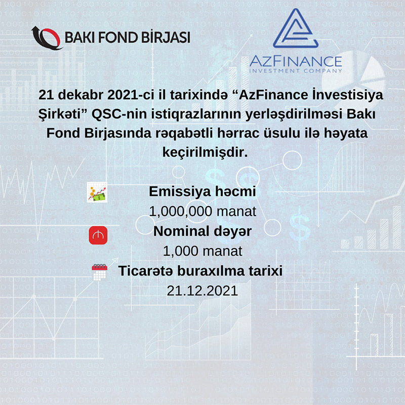 21 dekabr 2021-ci il tarixində Bakı Fond Birjasında “AzFinance İnvestisiya Şirkəti” QSC-nin AZ2002019712 dövlət qeydiyyat nömrəli, 1 milyon manat həcmində, diskontlu, təmin edilməmiş sənədsiz, adlı istiqrazlarının yerləşdirilməsi üzrə hərrac yekunlaşıb.