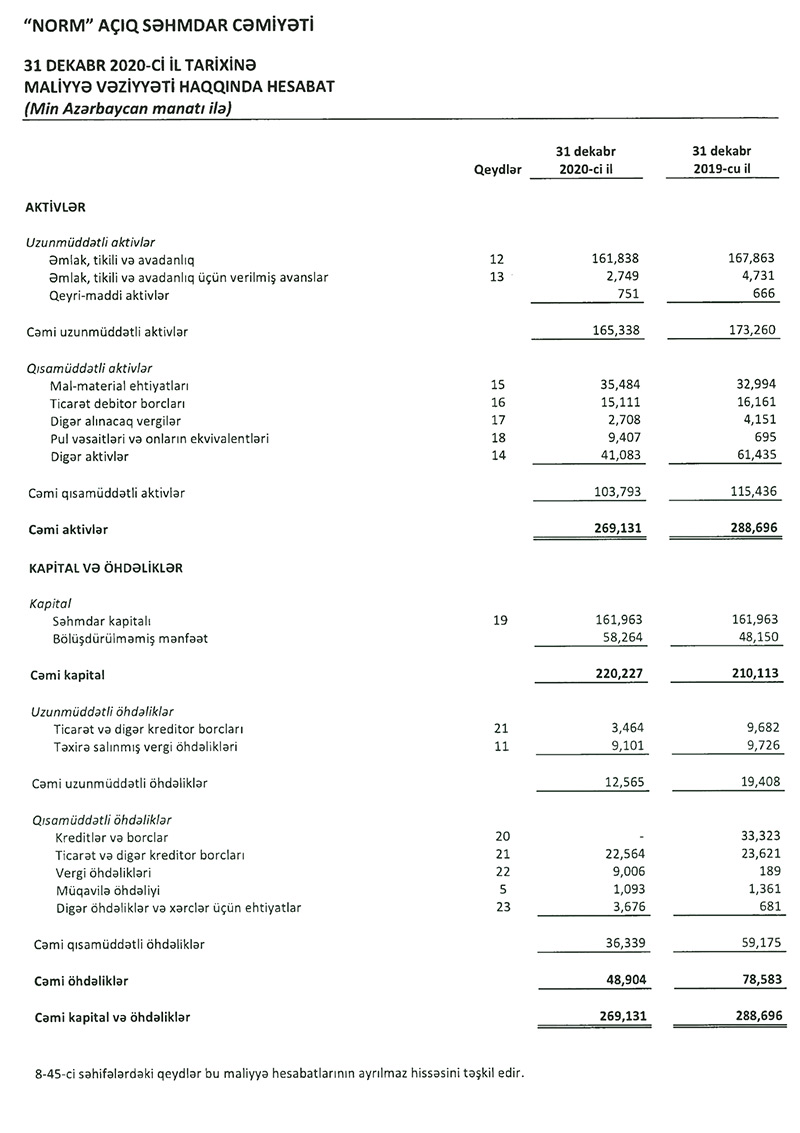 2019-cu illə müqayisədə 2020-ci ildə "Norm" ASC-nin cəmi aktivləri 6,8% azalaraq 269 milyon 131 min manata geriləyib. 2019-cu ilin sonunda şirkətin cəmi aktivləri 288 milyon 696 min manat təşkil etmişdi.