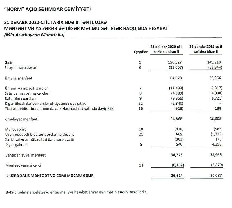 Marja.az şirkətin illik maliyyə hesabatına istinadən xəbər verir ki, “Norm” şirkətinin satışdan gəlirləri 2019-cu illə müqayisədə 2020-ci ildə 7 milyon 117 min manat və ya 4,8% artaraq 156 milyon 327 min manat təşkil edib.