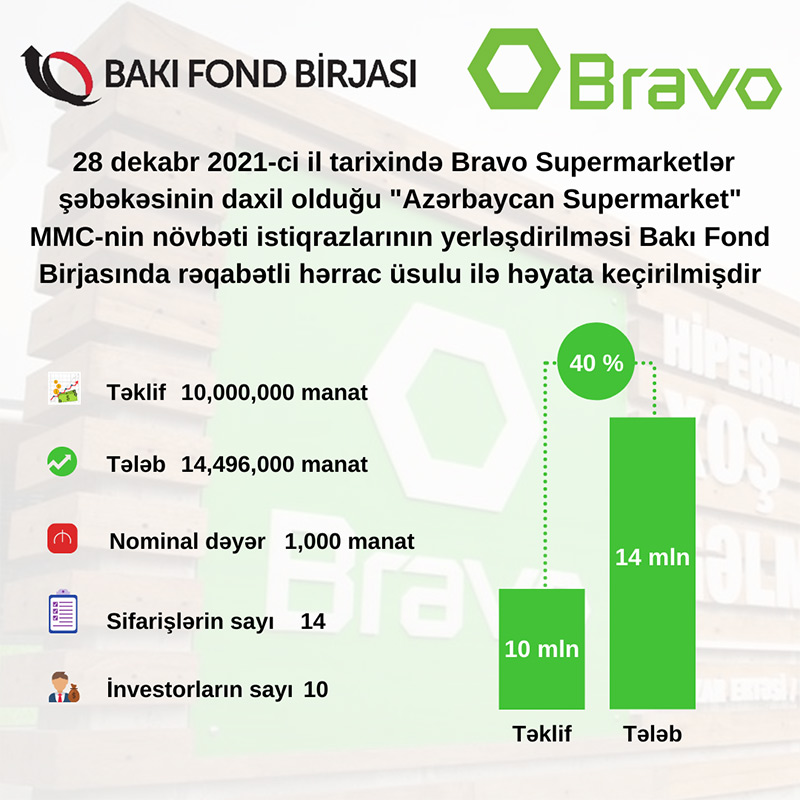 28 dekabr 2021-ci il tarixində Bakı Fond Birjasında Bravo Supermarketlər şəbəkəsinin də daxil olduğu "Azərbaycan Supermarket" MMC-nin tədavül müddəti 3 təqvim ili olan AZ2002023524 dövlət qeydiyyat nömrəli, 10 milyon manat həcmində, faizli, təmin edilməmiş sənədsiz, adlı istiqrazlarının yerləşdirilməsi üzrə hərrac yekunlaşıb.