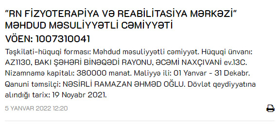 İqtisadiyyat Nazirliyi yanında Dövlət Vergilər Xidməti "RN Fizyoterapiya və Reabilitasiya Mərkəzi" MMC-ni dövlət qeydiyyatına alıb.