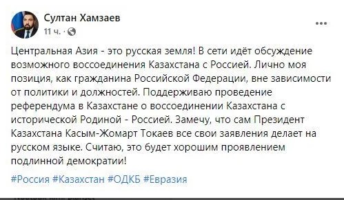 S.Həmzəyev, həmçinin, Mərkəzi Asiyanı “Rusiya torpağı” adlandıraraq bildirib ki, sosial şəbəkələrdə artıq Qazaxıstanın Rusiyaya mümkün ilhaqı müzakirə edilir.
