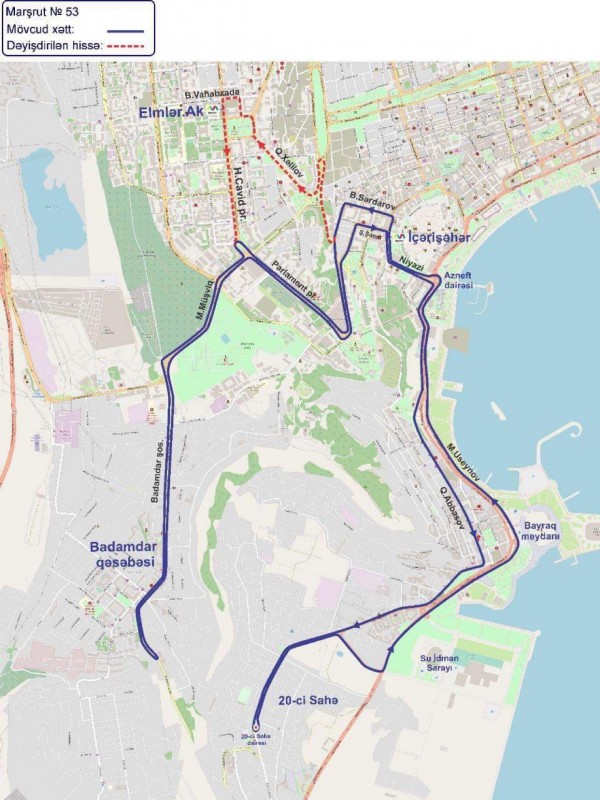 53 nömrəli müntəzəm marşrut xəttinin Badamdar qəsəbəsi istiqamətində hərəkət sxemində dəyişiklik olunaraq Qurban Xəlilov küçəsi – Landau küçəsi – Şəfaət Mehdiyev küçəsi – Bəxtiyar Vahabzadə küçəsi – Hüseyn Cavid prospekti – Mikayıl Müşfiq küçəsindən keçməklə təşkil edilib.