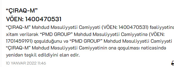 “Çıraq-M” Məhdud Məsuliyyətli Cəmiyyətinin fəaliyyətinə xitam verilərək “PMD Group” Məhdud Məsuliyyətli Cəmiyyətinə qoşulub.