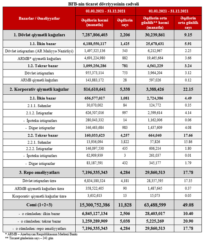 Marja Birjaya istinadən xəbər verir ki, Repo əməliyyatları üzrə ticarətin həcmi 2020-ci illə müqayisədə 2021-ci ildə 3,3 dəfə artaraq 7 milyard 196 milyon 335 min manat təşkil edib. 2020-ci ildə Birjada 2 milyard 150 milyon 180 min manatlıq repo əməliyyatları aparılmışdı.