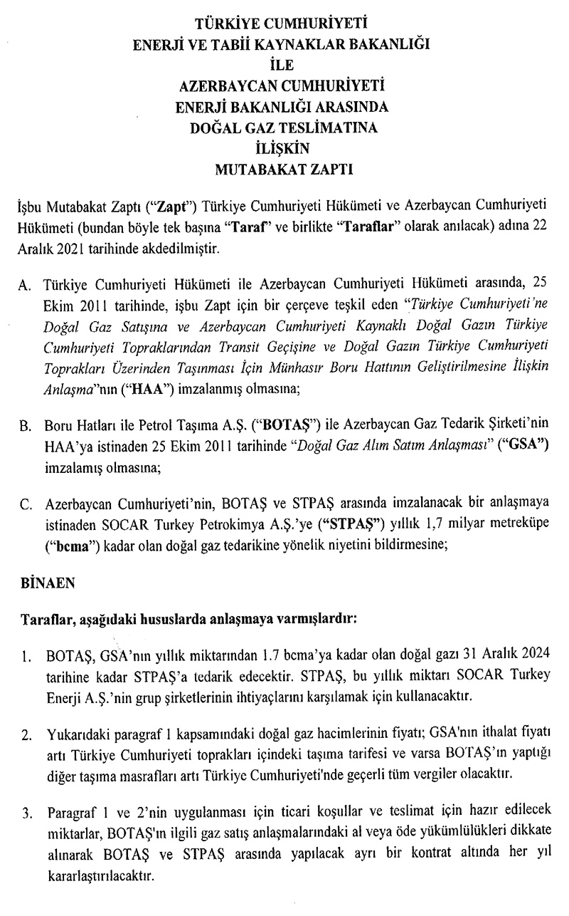 Marja xəbər verir ki, "Rəsmi Qəzet"in bugünkü sayında dərc olunan razılaşma çərçivəsində Türkiyənin Azərbaycandan almağı öhdəsinə götürdüyü 1,7 milyard kubmetrə qədər təbii qaz 2024-cü ilin sonuna qədər "SOCAR Turkey Petrokimya AŞ" tərəfindən alınacaq.
