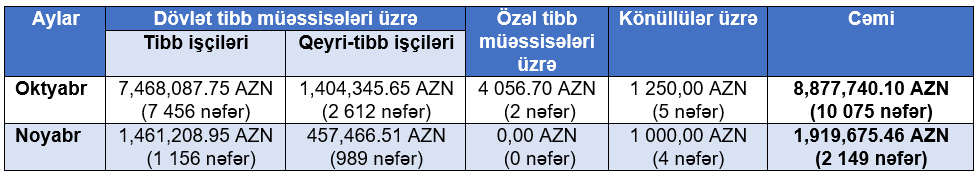 Tibb və qeyri-tibb tibb işçilərinə, eləcə də könüllülərə qeyd edilən aylar üzrə ödənilən müddətli əlavə və mükafatların məbləği aşağıdakı kimidir: