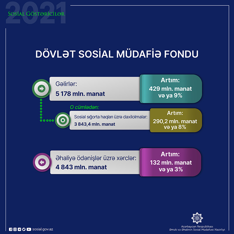 Əmək və Əhalinin Sosial Müdafiəsi Nazirliyinin tabeliyindəki Dövlət Sosial Müdafiə Fondunun (DSMF) gəlirləri keçən il 429 milyon manat və ya 9% artaraq 5178 milyon manat təşkil edib.