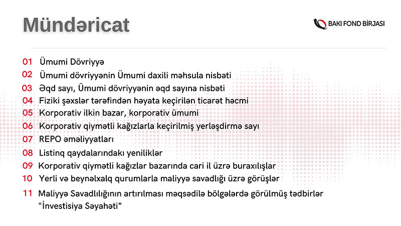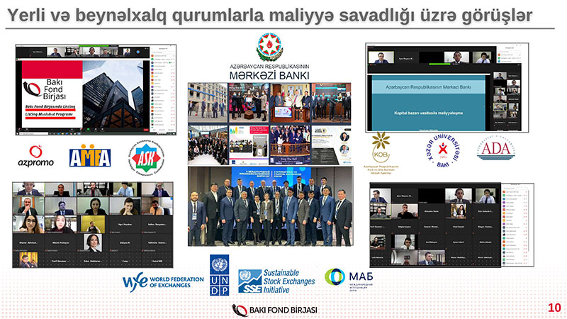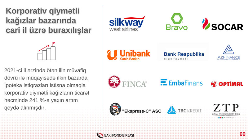 Məlumatda qeyd edilib ki, qiymətli kağızlar bazarının stabil inkişafının təmin edilməsi və korporativ qiymətli kağızlar seqmentinin canlandırılması məqsədilə Bakı Fond Birjası tərəfindən 2021-2023-cü illər üzrə müəyyən edilmiş strateji prioritetlərə uyğun olaraq listinqin stimullaşdırılması, yeni emitentlərin listinqə cəlb edilməsi, beynəlxalq təcrübəyə uyğun hüquqi çərçivənin formalaşdırılması və biznes prusedurların optimizasiyası üzrə işlər davam etdirilmişdir.