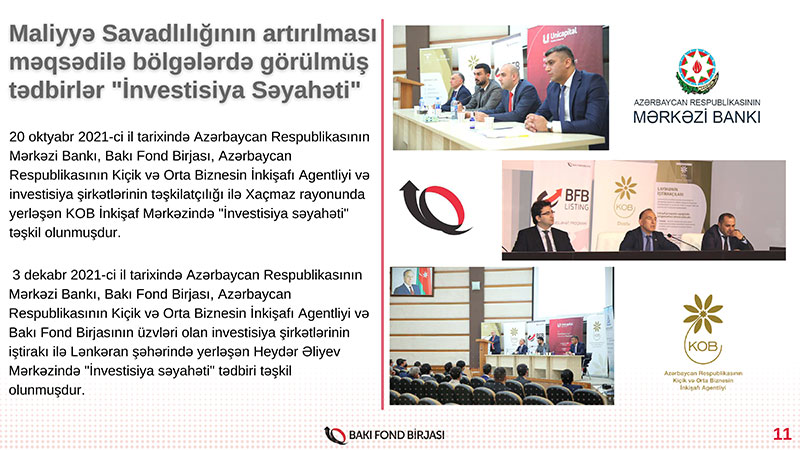 Kapital bazarına dair maliyyə savadlılığının artırılması məqsədilə Bakı Fond Birjası müvafiq dövlət qurumları və investisiya şirkətlərinin iştirakı ilə intensiv maarifləndirmə tədbirləri təşkil etmiş, o cümlədən 30-a yaxın görüş, video-konfrans və seminar keçirilmişdir. 2021-ci il ərzində ilk dəfə olaraq Mərkəzi Bank, Bakı Fond Birjası, Kiçik və Orta Biznesin İnkişafı Agentliyinin təşkilatçılığı ilə “İnvestisiya Səyahəti” layihəsinə start verilmiş və layihə çərçivəsində regionlarda olan biznes subyektlərinə kapital bazarının üstünlüklərinə dair ətraflı məlumat verilmişdir.