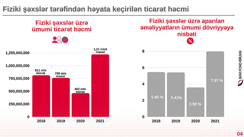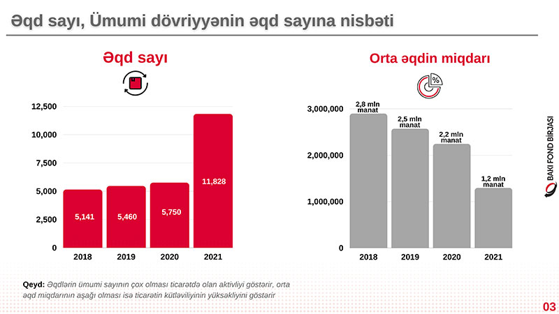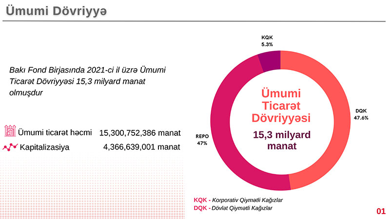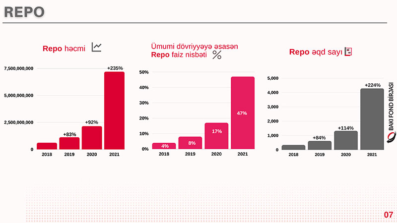 2021-ci il repo əməliyyatlarının həcmi üzrə 7,2 milyard manat olmaqla Bakı Fond Birjasının tarixində son illərin ən yüksək dövriyyəsi qeydə alınmışdır. Müqayisə olaraq, 2018-2020-ci illər ərzində bu göstərici ümumilikdə 3,8 milyard manat təşkil etmişdir. Bakı Fond Birjasının ümumi ticarət dövriyyəsinin ÜDM-ə nisbəti 18 faizə yüksəlmişdir.
