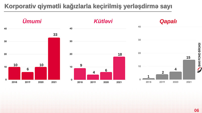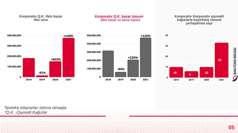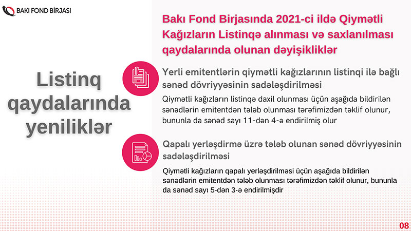2021-ci ildə özəl sektorun kapital bazarından maliyyələşmə təşəbbüslərinin və fond birjasında listinqinin təşviqi məqsədilə Bakı Fond Birjasının listinq tələbləri sadələşdirilmiş və kapital bazarında Azərbaycan Respublikasının Mərkəzi Bankı (Mərkəzi Bank) tərəfindən müəyyən edilmiş stimullaşdırıcı tarif rejiminin tətbiqinə başlanmışdır. Eyni zamanda, korporativ qiymətli kağızların kütləvi təklifinin stimullaşdırılması məqsədilə Bakı Fond Birjası tərəfindən anderraytinq xidməti göstərən investisiya şirkətlərinin mükafatlandırılması mexanizmi tətbiq edilmişdir. Bu isə öz növbəsində qiymətli kağızların kütləvi təklif üsulu ilə fond birjasında yerləşdirilməsi imkanlarına müsbət təsir göstərmişdir.