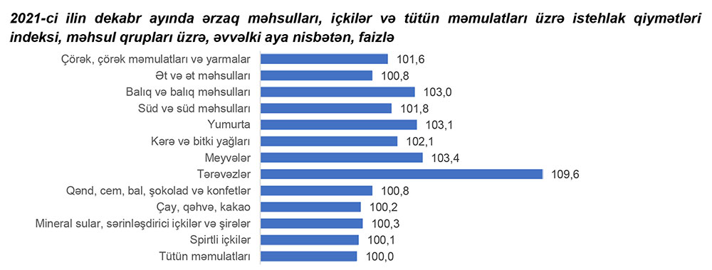 2021-ci ilin dekabr ayında ərzaq məhsulları, içkilər və tütün məmulatları üzrə istehlak qiymətləri indeksi əvvəlki aya nisbətən 2,6 faiz, 2020-ci ilin dekabr ayına nisbətən 15,8 faiz artıb.