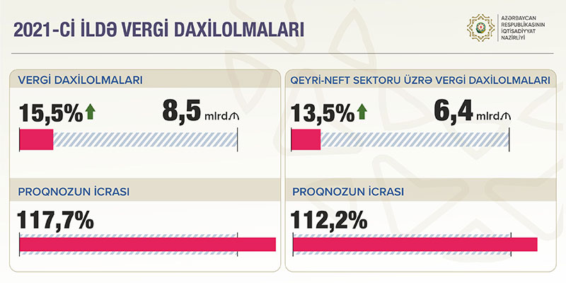 2021-ci ildə vergi daxilolmaları 15,5% artaraq 8,5 milyard manat təşkil edib və proqnoz 117,7% səviyyəsində icra olunub