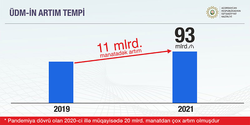 Azərbaycanda ümumi daxili məhsulun (ÜDM) nominal həcmi 93 milyard manata çatıb və bu, 2019-cu illə müqayisədə 11 milyard manatadək çoxdur.