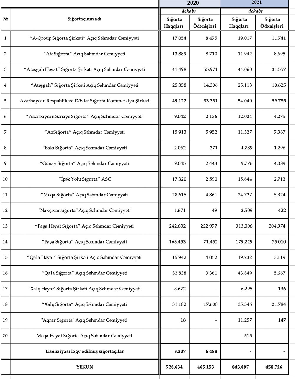 2021-ci il ərzində Azərbaycandakı 20 sığorta şirkətinin xətti ilə 843 milyon 897 min manat məbləğində sığorta haqqı toplanılıb.