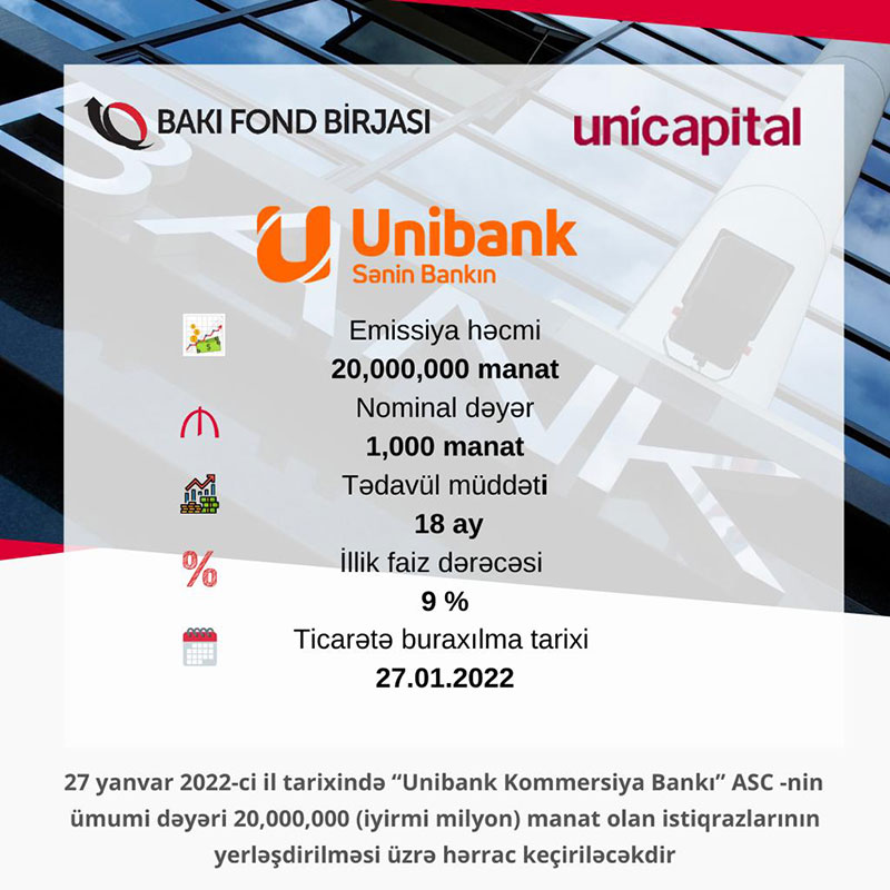 Birjanın yaydığı məlumata görə, 27 yanvar 2022-ci il tarixində “Unibank Kommersiya Bankı” ASC-nin istiqrazlarının yerləşdirilməsi Bakı Fond Birjasında rəqabətli hərrac üsulu ilə həyata keçiriləcəkdir.