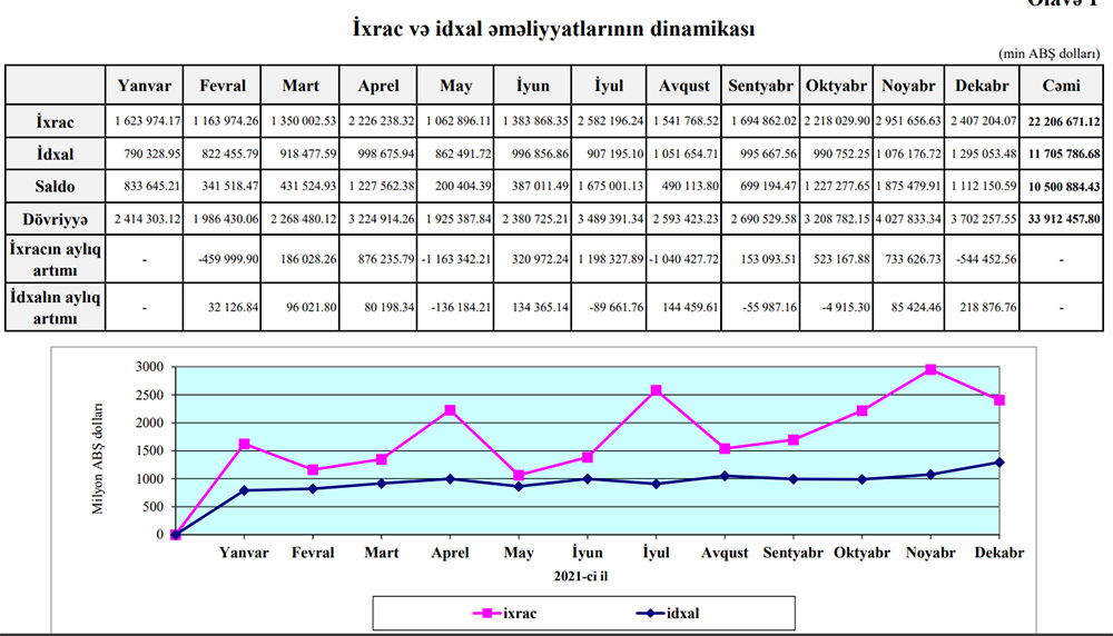Xatırladaq ki, 2020-ci ildə ticarət əməliyyatlarının həcmi 24 milyard 471 milyon 288 min ABŞ dolları, o cümlədən idxal 10 milyard 730 milyon 720 min ABŞ dolları, ixrac 13 milyard 740 milyon 568 min ABŞ dolları təşkil etmişdi. Saldo müsbət 3 milyard 9 milyon 847 min dollar olmuşdu.
