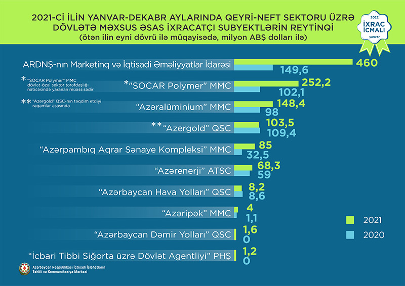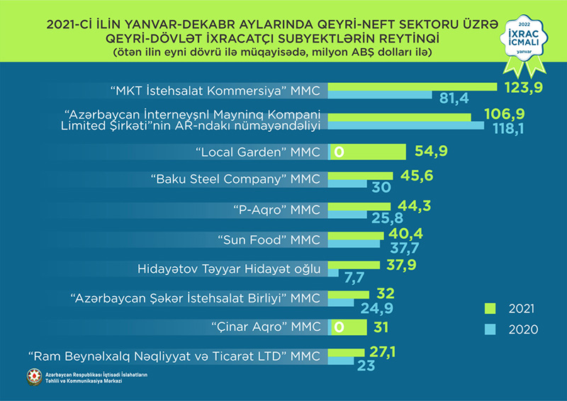 2021-ci ilin yanvar-dekabr ayları ərzində ixrac edilən qeyri-neft sektoruna aid malların siyahısında pambıq mahlıcı (208 milyon ABŞ dolları) birinci olub. Bu siyahıda qızıl (202,5 milyon ABŞ dolları) ikinci, pomidor (tomat) (160,2 milyon ABŞ dolları) isə üçüncü yerdə qərarlaşıb.