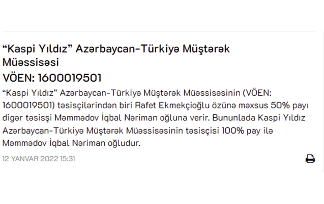 Məlumata görə, şirkətin təsisçilərindən biri Rafet Ekmekçioğlu özünə məxsus 50% payı digər təsisçi Məmmədov İqbal Nəriman oğluna verib. Bununla da “Kaspi Yıldız” Azərbaycan-Türkiyə Müştərək Müəssisəsinin təsisçisi 100% pay ilə Məmmədov İqbal Nəriman oğlu olub.