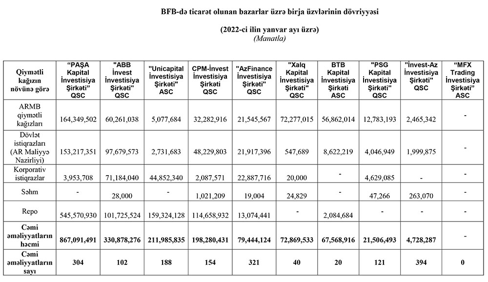 2022-ci ilin yanvar ayı üzrə Bakı Fond Birjasında (BFB) ticarət olunan bazarlar üzrə birja üzvlərinin dövriyyələri açıqlanıb.