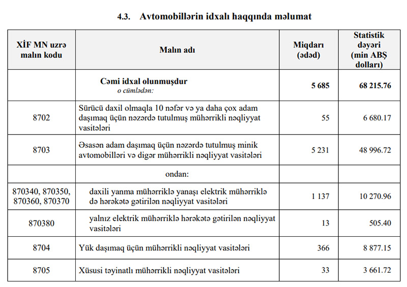 2021-ci ilin Yanvar ayında Azərbaycana 53 milyon 445 min dollar dəyərində 4 min 642 ədəd avtomobil idxal edilmişdi.