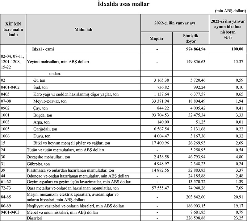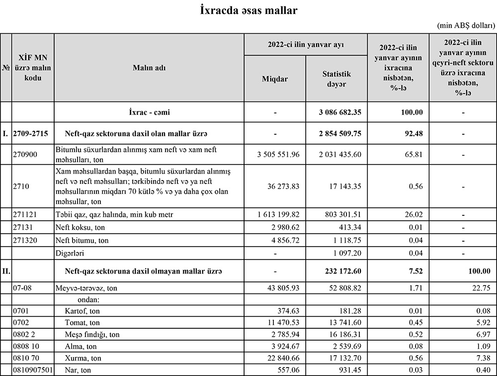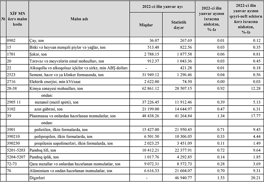 2022-ci ilin yanvar ayında Azərbaycanın ən çox ixrac və idxal etdiyi mallar açıqlanıb.