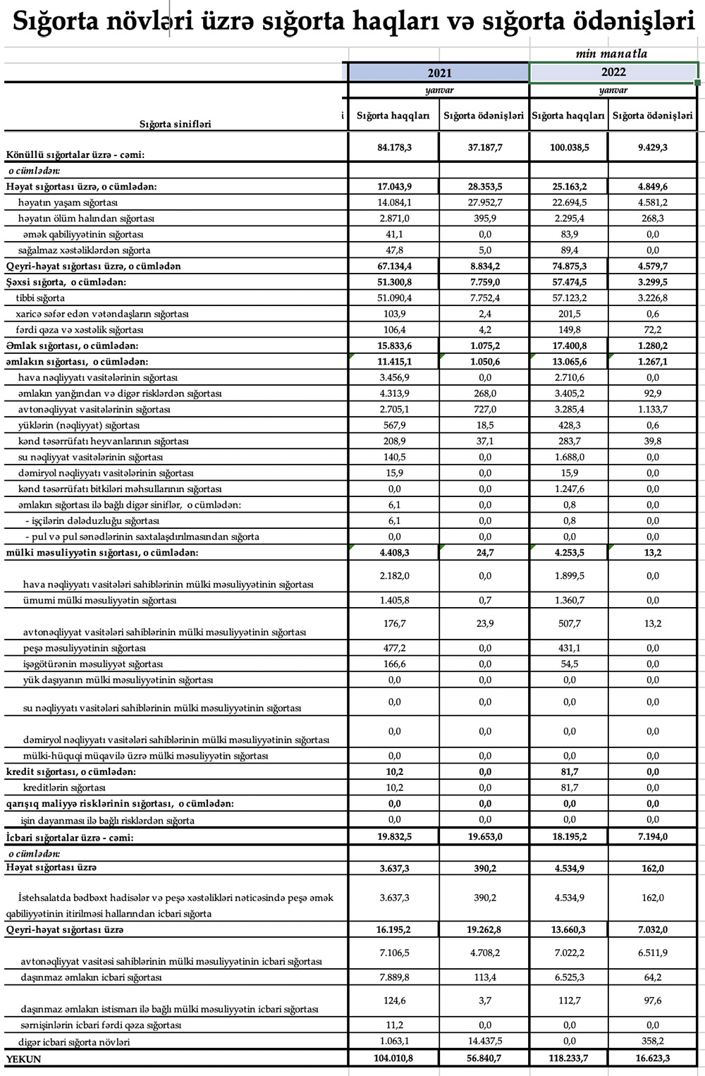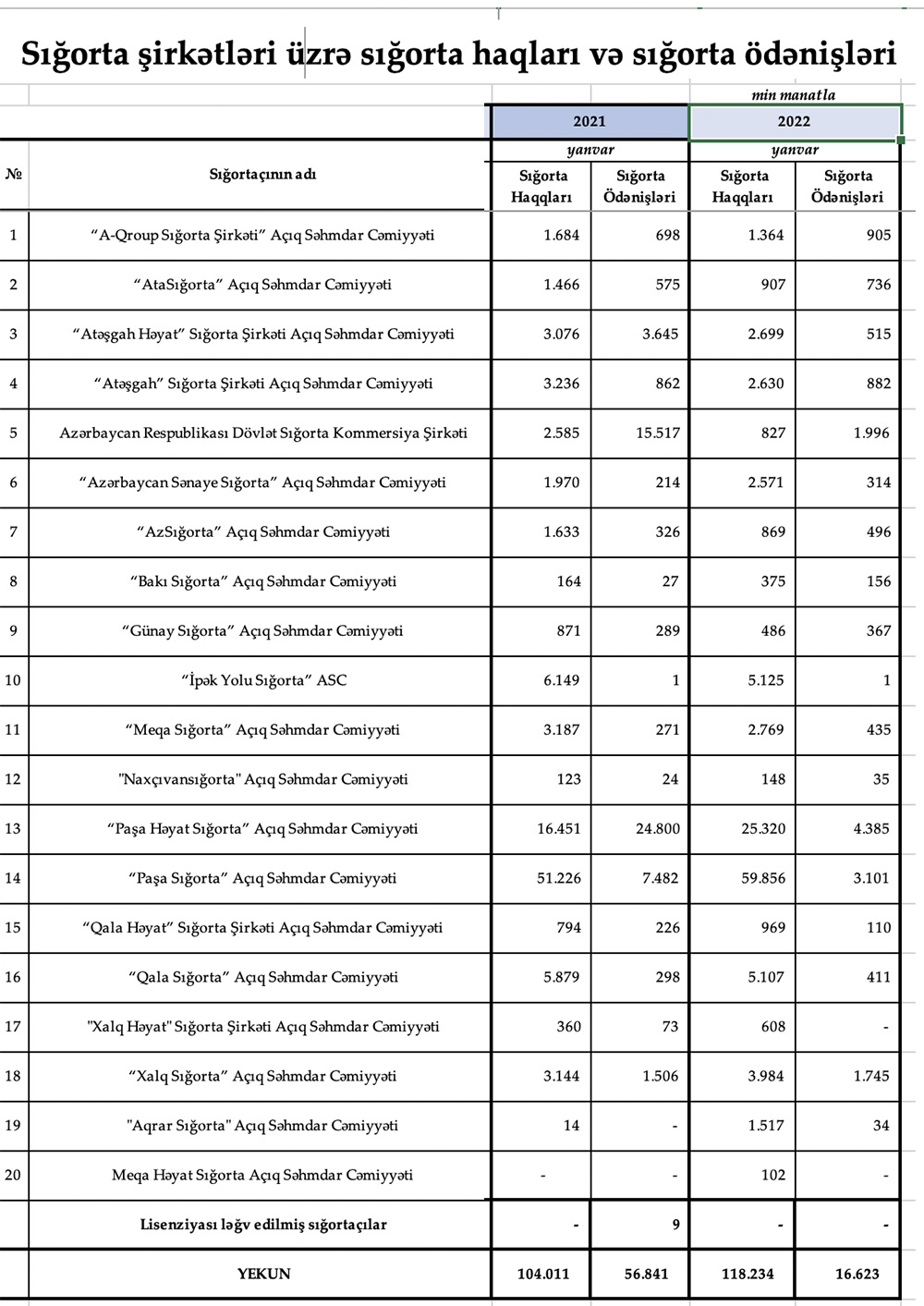 Azərbaycanda fəaliyyət göstərən 20 sığorta şirkətindən 10-nun hesabladığı sığorta haqları 2022-ci ilin yanvar ayında ötən ilin yanvar ayı ilə müqayisədə azalıb.