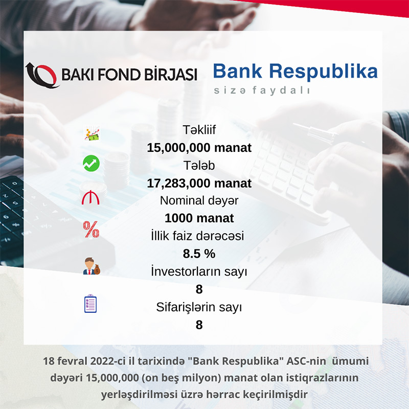 18 fevral 2022-ci il tarixində Bakı Fond Birjasında "Bank Respublika" ASC-nin tədavül müddəti 2 təqvim ili olan AZ2004002880 dövlət qeydiyyat nömrəli, 15 milyon manat həcmində, faizli, təmin edilməmiş sənədsiz, adlı istiqrazlarının yerləşdirilməsi üzrə hərrac yekunlaşıb.