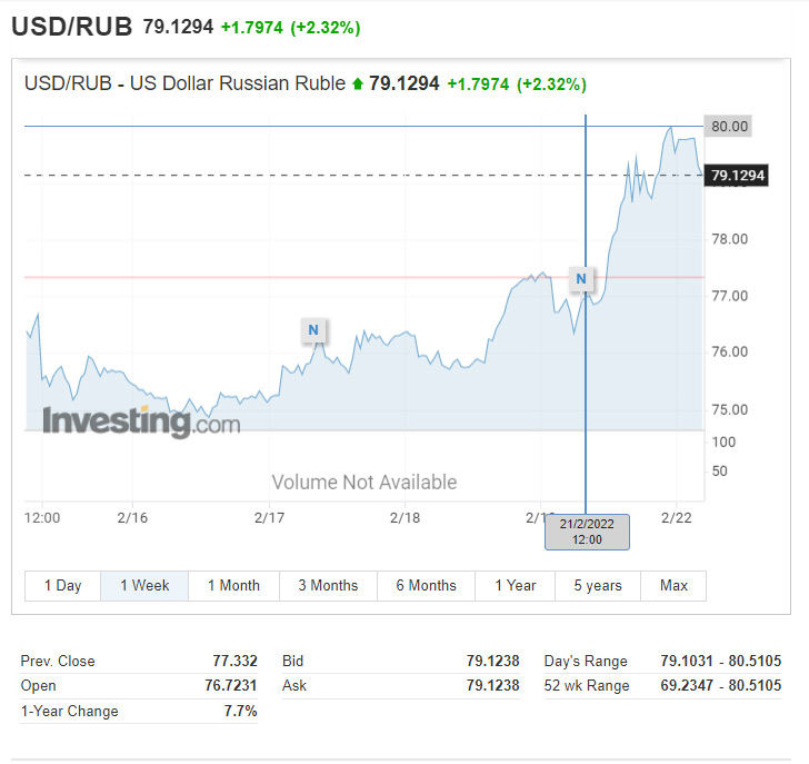 Gərginlik daha da artarsa, dolların 82-86 rubl bölgəsinə yüksələcəyi gözlənilir. Rusiyanın iştirakı ilə Ukraynada müharibə ssenarisinə görə, rublun məzənnəsi daha 15-20% zəifləyə bilər.