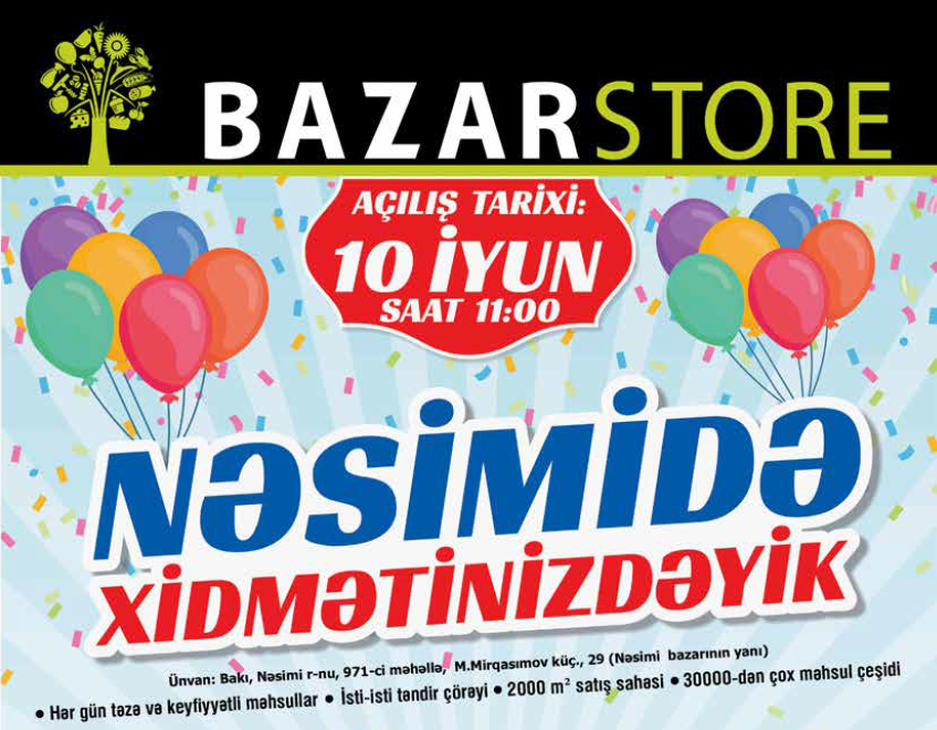 “Marja” xəbər verir ki, İyunun 10-da Nəsimi bazarının yanında ( M. Mirqasımov.,29) "Bazarstore” şöbəsi istifadəyə veriləcəkdir.