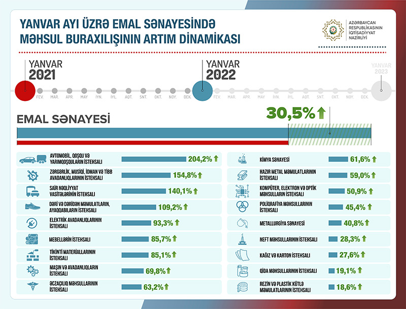 Bu ilin yanvar ayında emal sənayesində məhsul istehsalı ötən ilin yanvar ayına nisbətən 30,5% artıb.