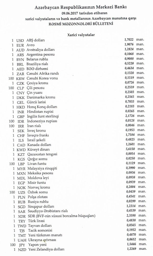 İyunun 9-na Mərkəzi Bankın açıqladığı rəsmi Dollar/manat məzənnəsi İyunun 8-i ilə müqayisədə dəyişməyərək 1,7022 manat olub, Avro/manat məzənnəsi isə 1.9076 manata düşüb.