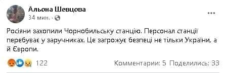 Bundan əvvəl Ukrayna Prezidenti Vladimir Zeleskiy bildirmişdi ki, Rusiya işğalçı qüvvələri Çernobıl Atol Elektrik Stansiyasını ələ keçirməyə çalışır: "Bu, bütün Avropaya müharibə elanıdır. Müdafiəçilərimiz 1986-cı il faciəsinin bir daha təkrarlanmaması üçün canlarını verirlər. Bu barədə İsveç Baş nazirinə məlumat vermişəm".**
