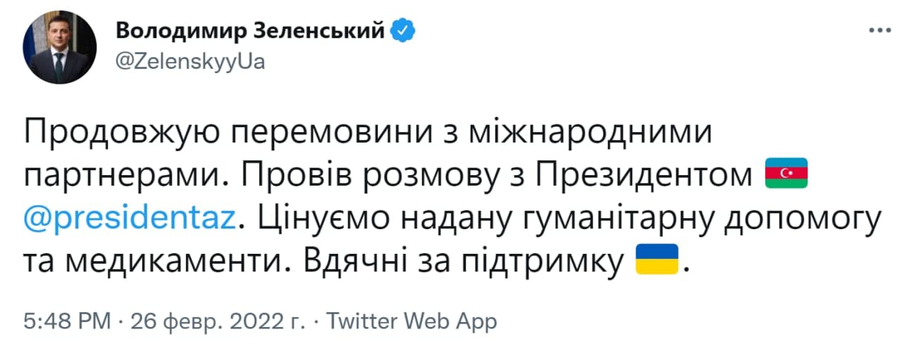 "Beynəlxalq tərəfdaşlarla danışıqları davam etdirirəm. Azərbaycan Prezidenti ilə söhbət etdim. Biz göstərilən humanitar yardımı və dərmanları yüksək qiymətləndiririk. Dəstəyiniz üçün təşəkkür edirik",- Zelenski Tvitter səhifəsində yazıb.