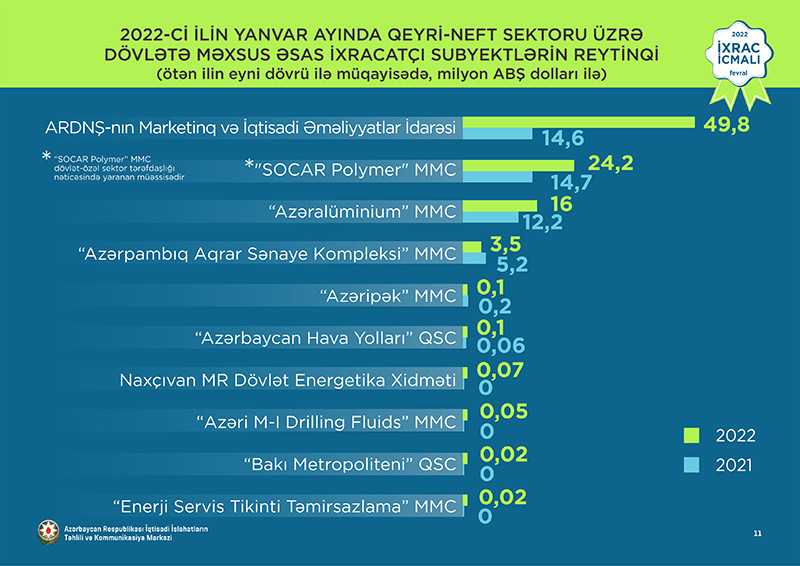 2022-ci ilin yanvar ayı üzrə hazırlanan qeyri-dövlət ixracatçı subyektlərin reytinqində ilk onluqda aşağıdakı şirkətlər təmsil olunurlar: