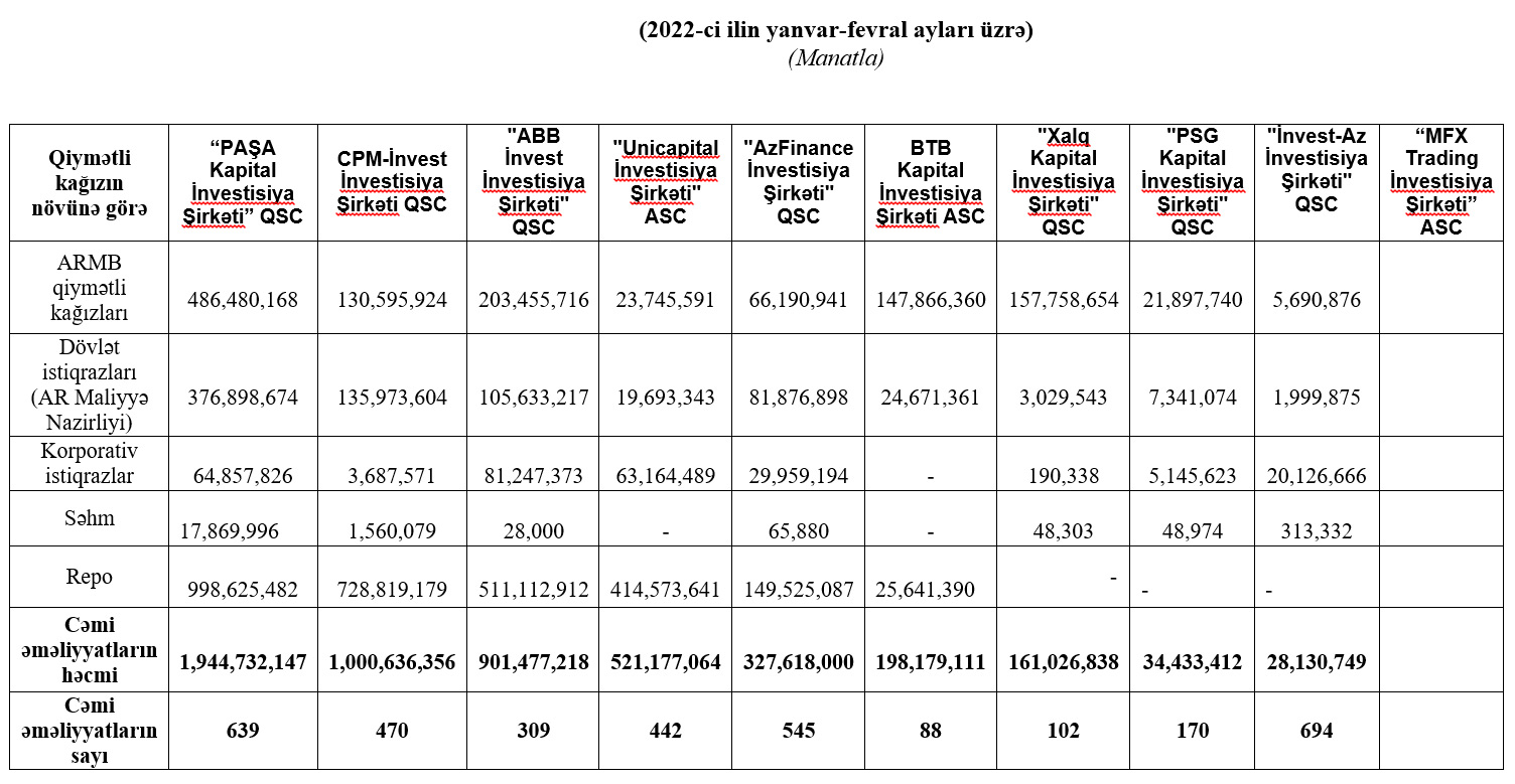 2022-ci ilin yanvar-fevral ayları üzrə Bakı Fond Birjasında (BFB) ticarət olunan bazarlar üzrə birja üzvlərinin dövriyyəsi açıqlanıb.