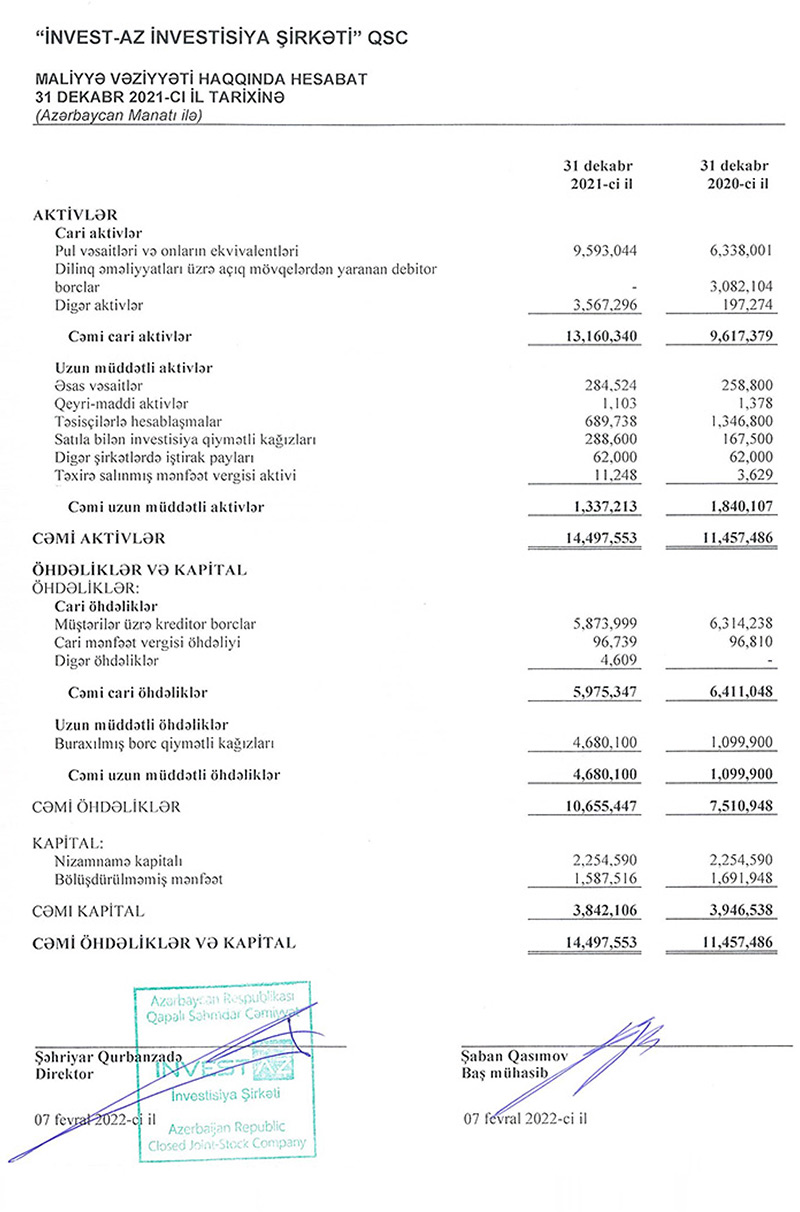 31 dekabr 2021-ci il tarixində "İnvest-AZ" 14 milyon 497 min manat cəmi aktivlərə malik olub, bu, 2020-ci ilin sonu ilə müqayisədə çoxdur. Keçən ilin sonunda Şirkətin nizamnamə kapitalı 2 milyon 255 min manat, cəmi kapitalı isə 3 milyon 842 min manat təşkil edib.