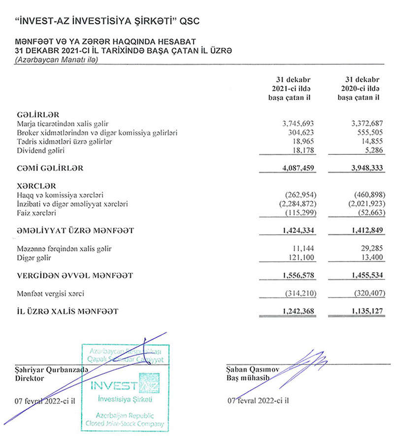 "İnvest-AZ İnvestisiya Şirkəti" QSC 2021-ci ili 1 milyon 242 min manat xalis mənfəət ilə başa vurub.