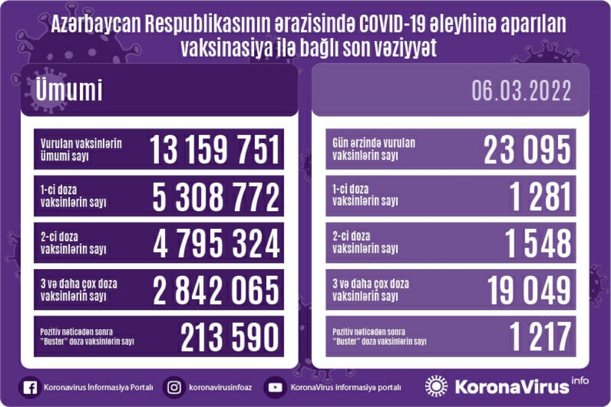 Nazirlər Kabineti yanında Operativ Qərargahdan verilən məlumata görə, bir gündə birinci mərhələ üzrə vaksinasiya olunanların sayı 1 281, ikinci mərhələ üzrə vaksinasiya olunanların sayı 1548 , 3-cü və daha çox doza üzrə vaksinasiya olunanların sayı 19 049, pozitiv nəticədən sonra buster doza olunanların sayı isə 1 217 nəfərdir.