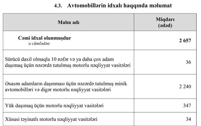Müqayisə üçün qeyd edək ki, 2016-cı ilin Yanvar- May aylarında Azərbaycana 2 233 ədəd avtomobil, o cümlədən 1939 ədəd minik avtomobili, 204 ədəd yük avtomobili, 32 ədəd avtobus, 58 ədəd xüsusi texnika idxal olunmuşdu.