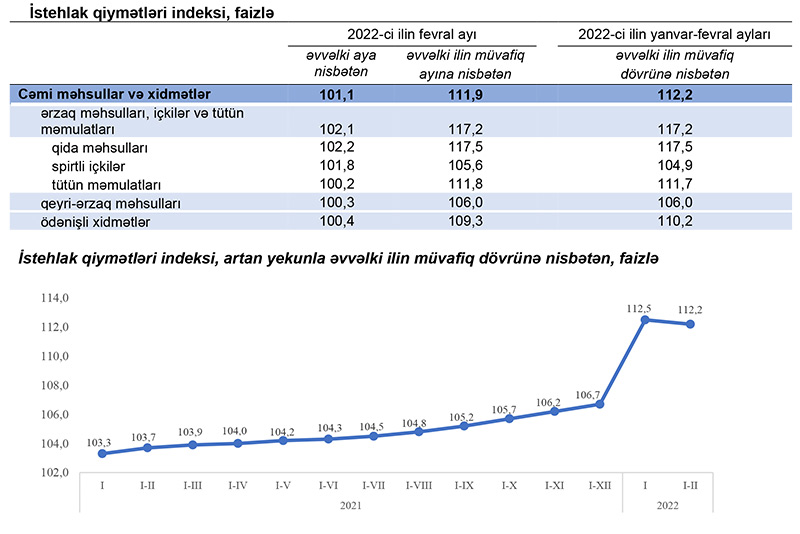 2022-ci ilin yanvar-fevral aylarında istehlak qiymətləri indeksi (inflyaiya göstəricisi) 2021-ci ilin yanvar-fevral aylarına nisbətən 12,2 faiz, o cümlədən ərzaq məhsulları, içkilər və tütün məmulatları üzrə 17,2 faiz, qeyri-ərzaq məhsulları üzrə 6 faiz, əhaliyə göstərilmiş ödənişli xidmətlər üzrə 10,2 faiz artıb.