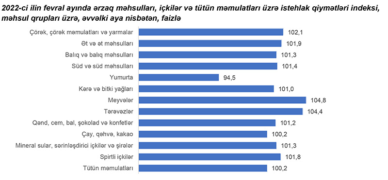2022-ci ilin fevral ayında ərzaq məhsulları, içkilər və tütün məmulatları üzrə istehlak qiymətləri indeksi əvvəlki aya nisbətən 102,1 faiz, əvvəlki ilin fevral ayına nisbətən 17,2 faiz yüksəlib.