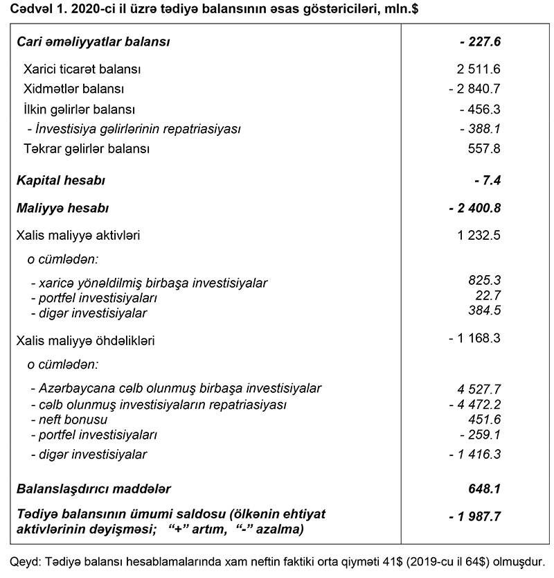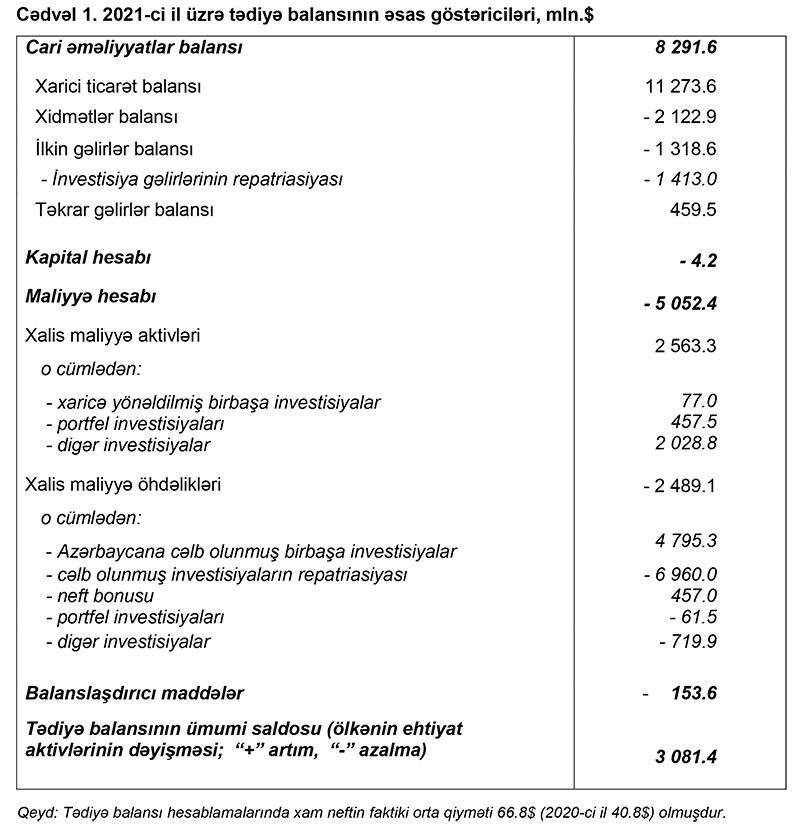 Qeyd edilib ki, əsasən qlobal əmtəə bazarlarında qiymətlərin bərpası və qeyrineft ixracının əhəmiyyətli artımından təsirlənmişdir. Cari əməliyyatlar balansında 8.3 mlrd. dollar, profisit, kapital və maliyyənin hərəkəti hesabında isə 5.1 mlrd.dollar kəsir yaranmış, ehtiyat aktivləri 3.1 mlrd. dollar artmışdır. Bu dövrdə xam neftin orta qiyməti 67 dollar/barel olmuş, qeyri-neft ixracı isə 44% artaraq 2.6 mlrd. dollar səviyyəsində formalaşmışdır.
