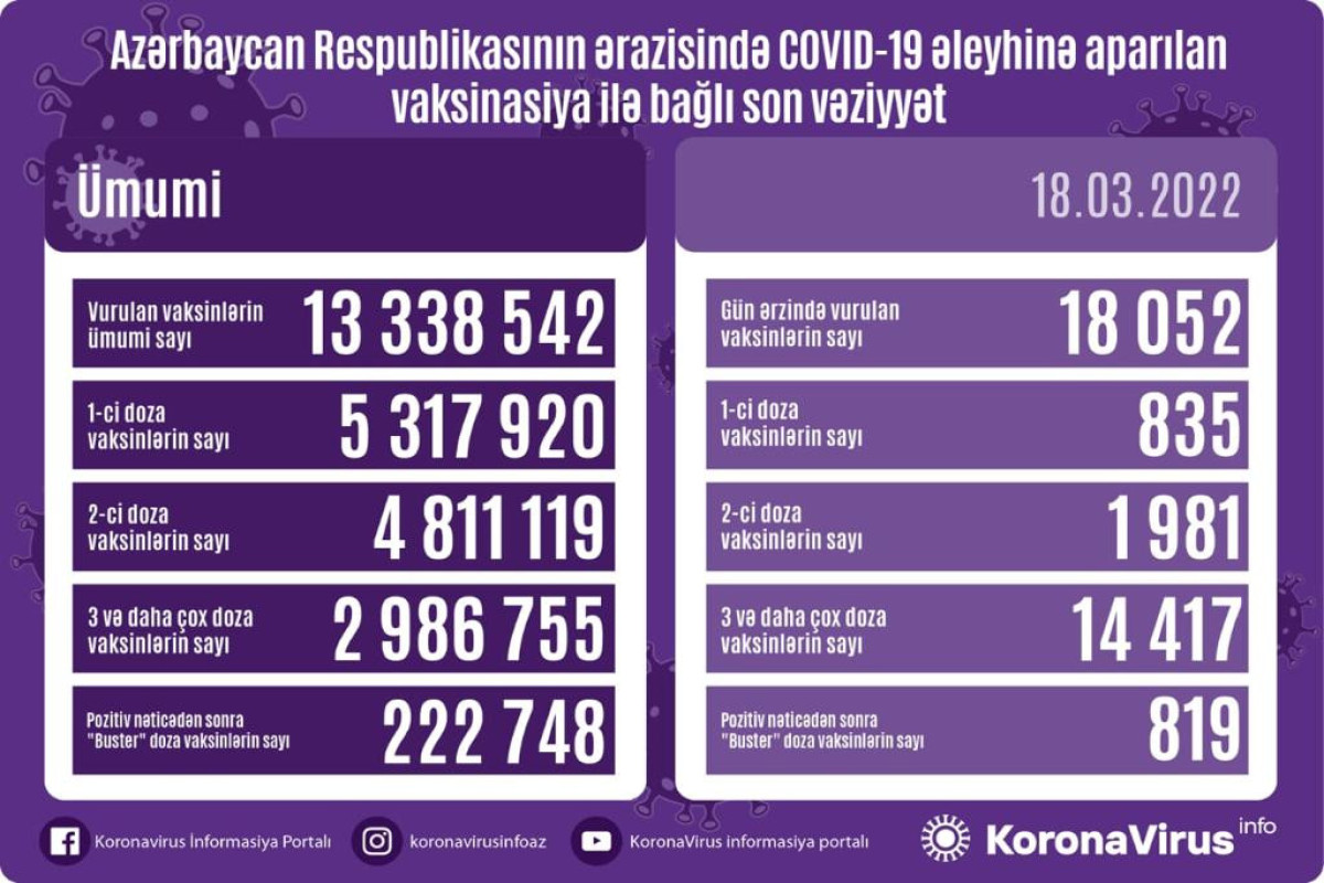 Azərbaycanda son sutkada koronavirus (COVID-19) əleyhinə 18 052 vaksin vurulub.