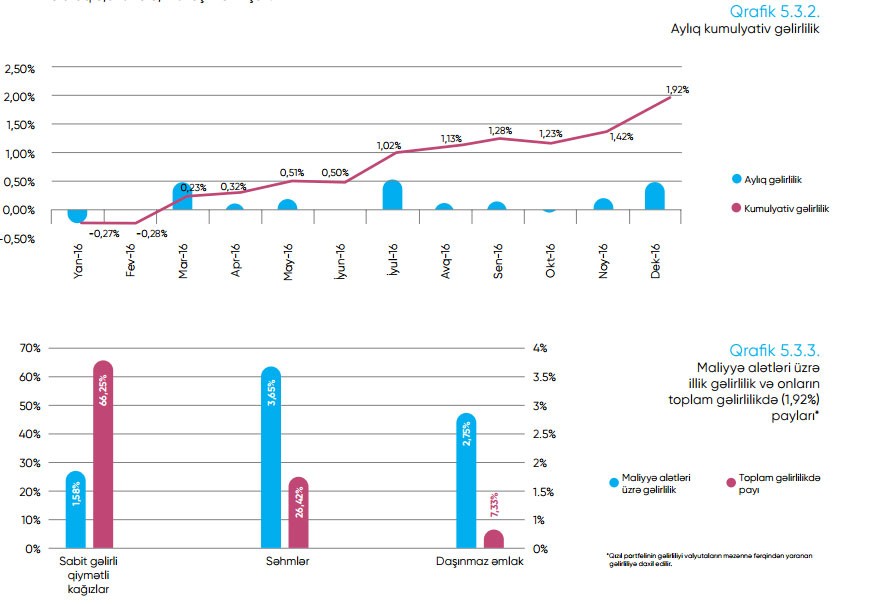 Hesabatda qeyd edilir ki, 2016-cı ildə sabit gəlirli qiymətli kağızlar portfeli üzrə illik gəlirlilik 1,58%, səhm portfeli (özəl səhmlər daxil olmaqla) üzrə 3,65%, daşınmaz əmlak portfeli üzrə isə 2,75% təşkil etmişdir. İnvestisiya portfelinin toplam gəlirliliyinə (1,92%) sabit gəlirli qiymətli kağızlar portfelinin töhfəsi 1,27%, səhm (özəl səhmlər daxil olmaqla) və daşınmaz əmlak portfellərinin töhfəsi isə müvafiq olaraq 0,51% və 0,14% təşkil etmişdir.