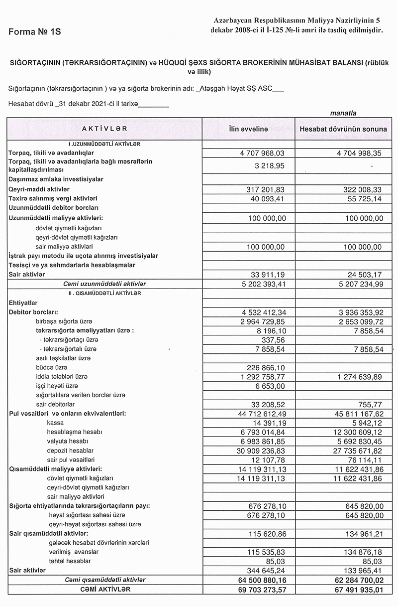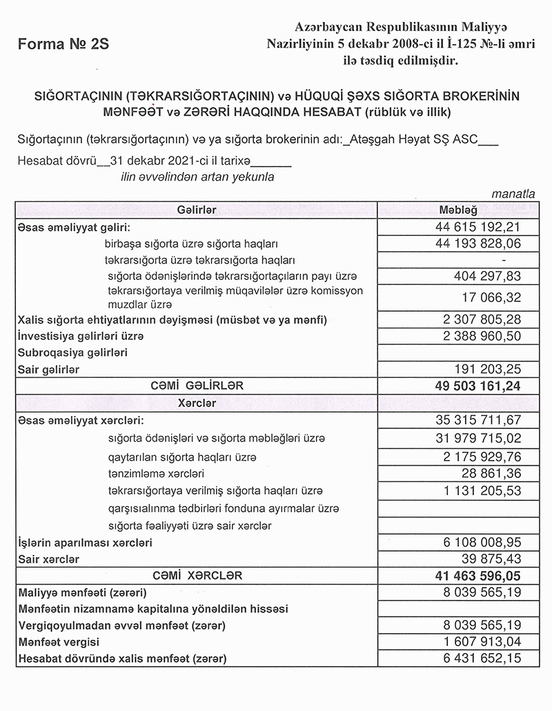 2021-ci ildə "Atəşgah Həyat Sığorta"nın investisiya gəlirləri 2 milyon 389 min manat təşkil edib (2020-ci ildə 4 milyon 80 min manat təşkil etmişdi)